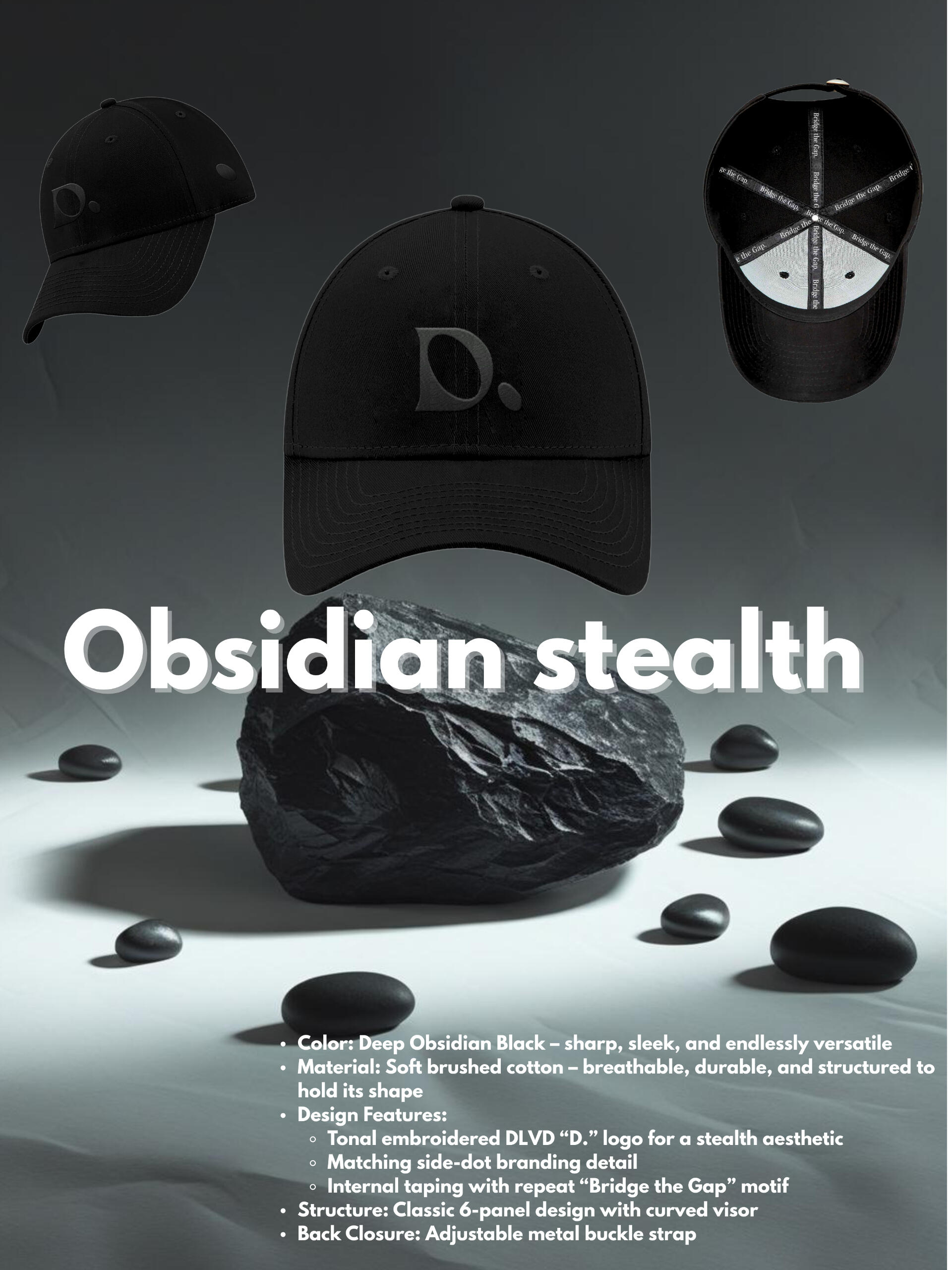 Obsidian Stealth a sleek monochrome essential built for quiet dominance. With a matte-on-matte embroidered logo and deep black palette, this cap doesn’t shout—it commands.Minimalism meets presence in its purest form. From underground studios to rooftop strategy sessions, Obsidian Stealth reflects the DLVD ethos: intentional, refined, uncompromising.Inside, the mantra "Bridge the Gap" lines the structure—subtle, consistent, powerful.