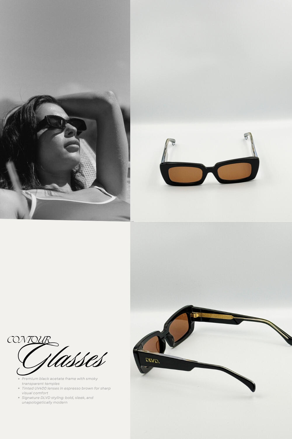 Sculpted for the modern tastemaker, the DLVD “Contour” Sunglasses are a bold reinterpretation of classic rectangular frames. Featuring deep brown lenses set within a high-gloss black acetate front and translucent temples, this pair balances sharp structure with contemporary fluidity.