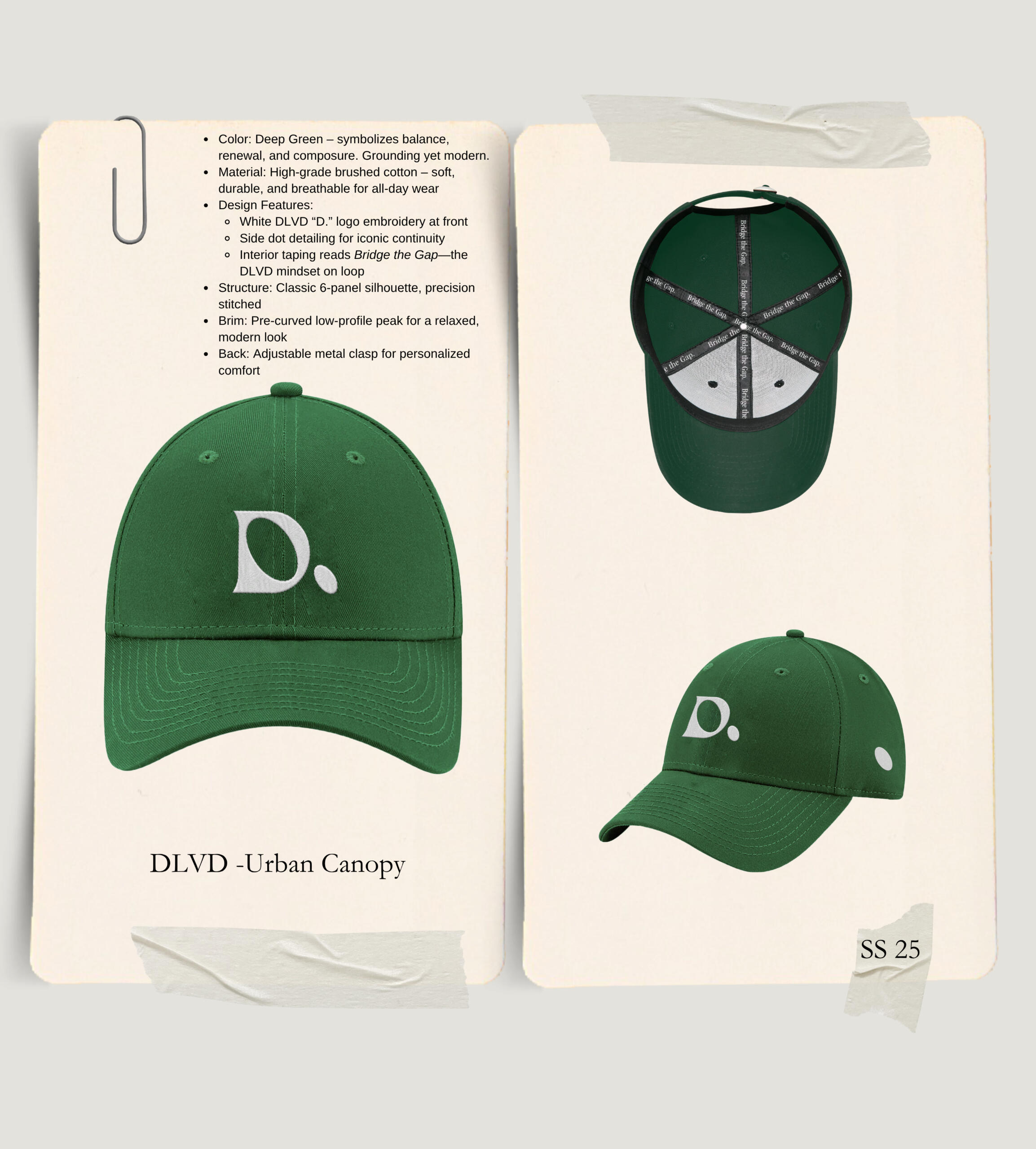 Urban Canopy speaks to clarity, composure, and cool confidence. It’s crafted for those who move through cities and systems with both grounding and grace—an understated leader’s essential.Framed in a rich forest green, the design delivers visual depth and unmistakable calm. The crisp embroidered DLVD “D.” mark takes center stage, anchored by the brand’s signature dot motif on the sides and the hidden interior mantra: "Bridge the Gap." A quiet declaration of intentionality.From day-to-day city wear to elevated minimal fits, this cap bridges bold vision with timeless structure.